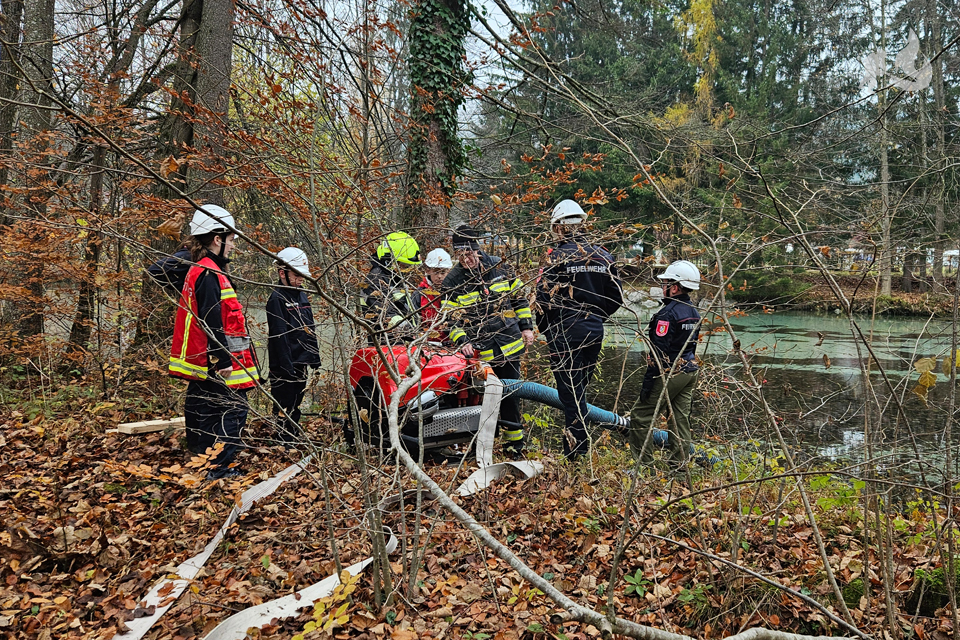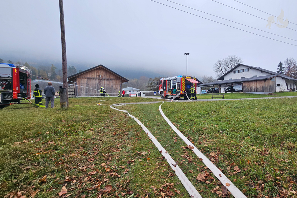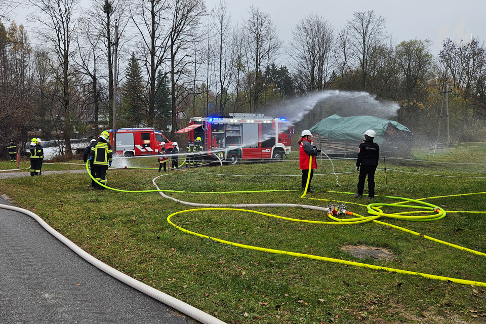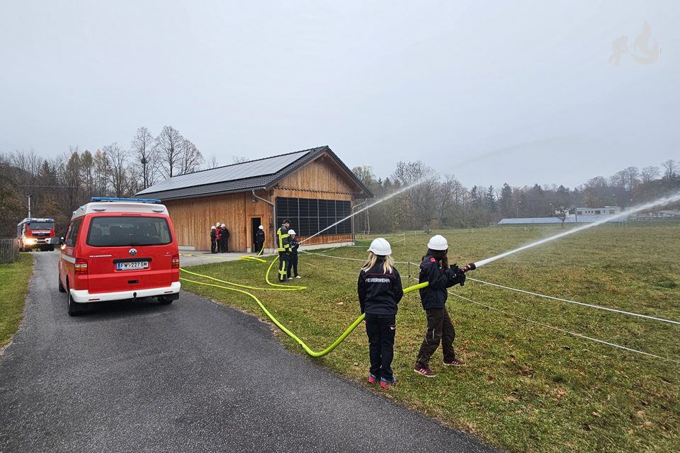 Bei der Übung wurde eine Wasserversorgung von der nahegelegenen Alm aufgebaut und aus allen Rohren gelöscht. So übten die Jugendlichen den Umgang mit dem Strahlrohr und das Aufbauen der Zubringerleitung von der Tragkraftspritze weg.